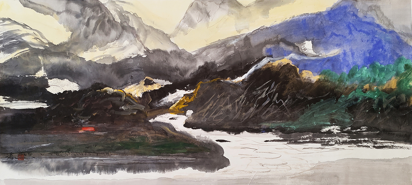 艺术家没有追求对自然的写实复刻,而是将山河的情绪提炼为色彩的交响:冷色的沉静与暖色的悸动、水墨的含蓄与色彩的张扬,共同构成了这场视觉的和声。《雁川》对“山水精神”的当代诠释。不是传统文人“卧游”式的避世寄托,而是以开放的姿态,让我们在壮阔的山河中看见自我。画中的河谷如一条流动的时间之河,连接着过去与当下;那抹朱红则是我们在苍茫天地间的精神坐标。在这个步履匆匆的时代,《雁川》以其恢弘的笔墨与浓烈的色彩,提醒我们:山河不仅是审美的对象,更是精神的原乡。我们凝望雁川,亦是凝望内心的辽阔与坚韧。