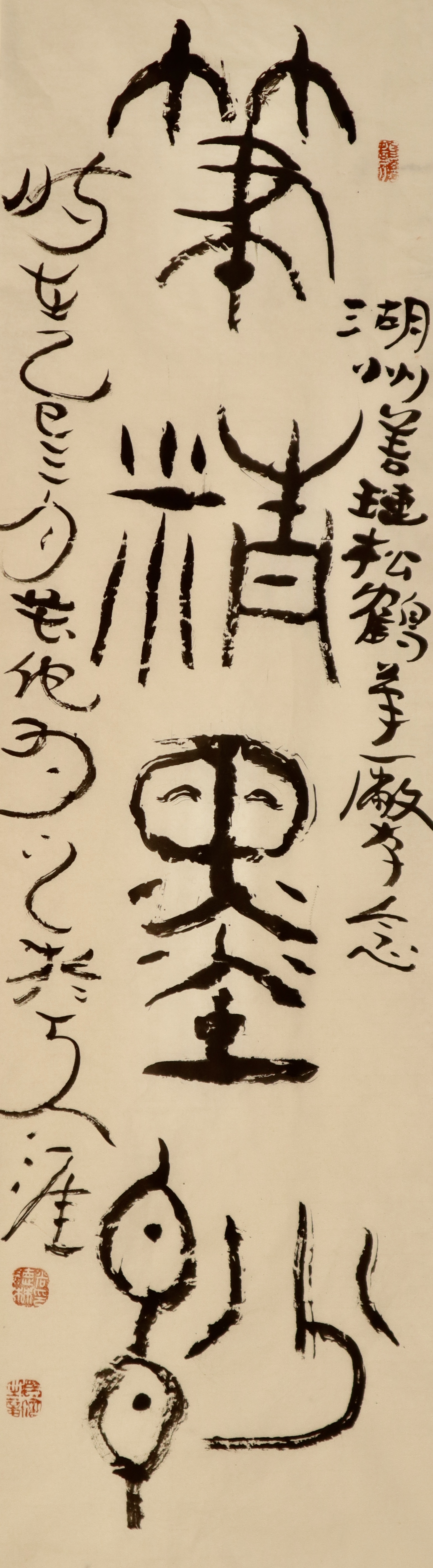 商周金文元素書法:筆精墨妙。為湖州善璉松鶴湖筆題字。Pictogram characters calligraphy artwork by Delin Shang in East LA.