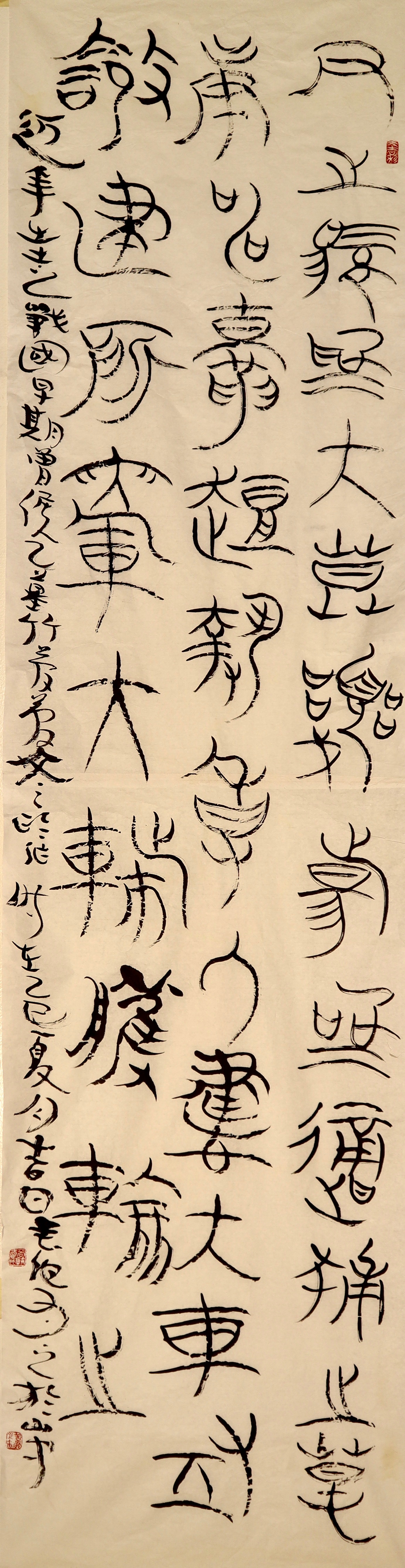 曾侯乙墓竹簡臨作。1978年出土隨州,書寫年代為戰國早期(約BC433-BC400),簡文為楚系文字,是迄今所知最早的简牍墨迹。The recreated Zhanguo dynasty was written on bamboo inscriptions, Calligraphy by Delin Shang in East LA.