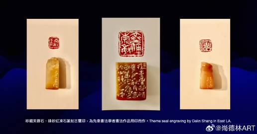 珍藏芙蓉石、硃砂紅凍石篆刻古璽印,為先秦書法學者書法作品用印而作。Theme seal engraving by Delin Shang in East LA.