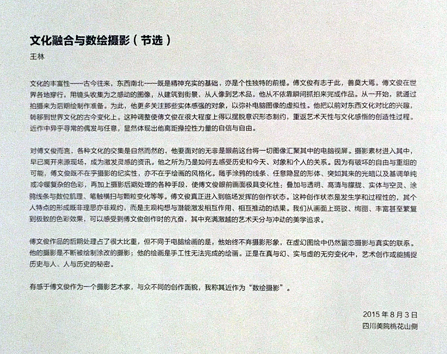 展览囊括了傅文俊从2008年至2015年不同创作时期的两组摄影作品,创作风格迥异,但创作思路始终是对历史与文化的反思。展览除呈现了策展人、广东美术馆馆长罗一平的策展前言外,同时也放置了著名批评家、西安美术学院博士生导师王林为傅文俊展览画册所写的序言。