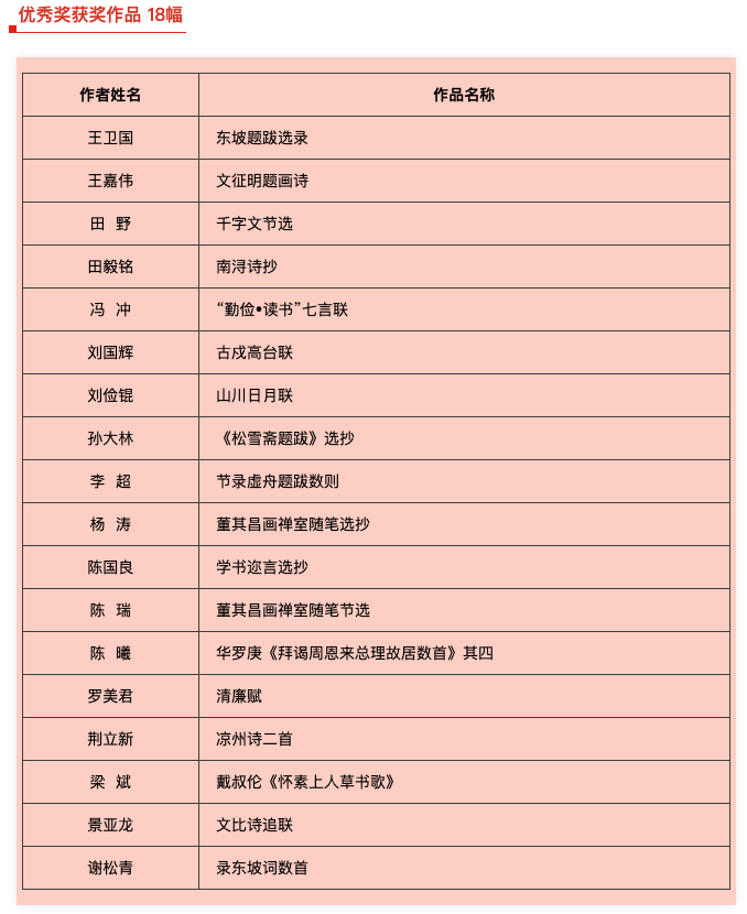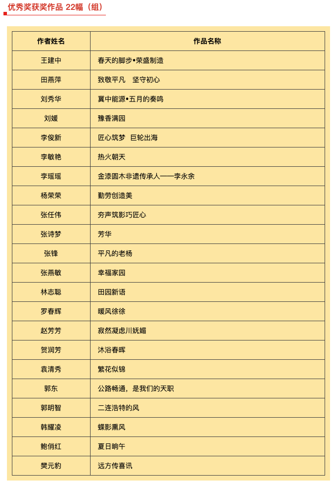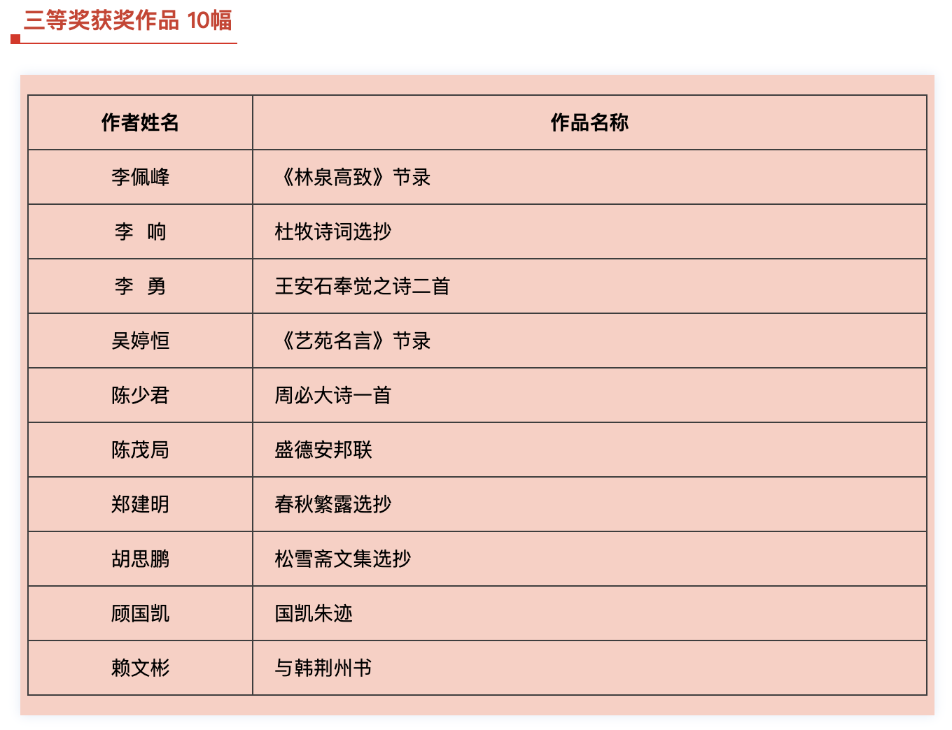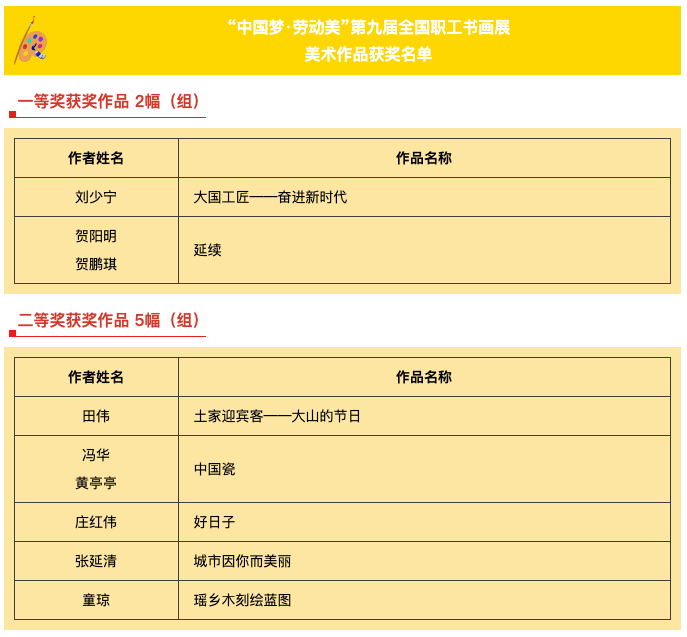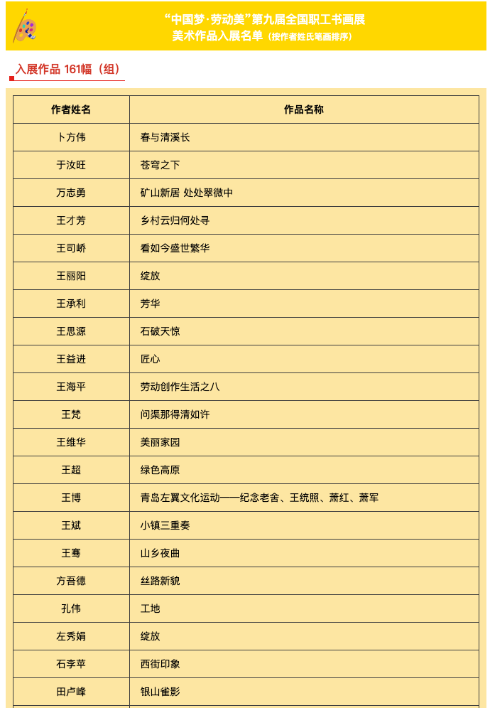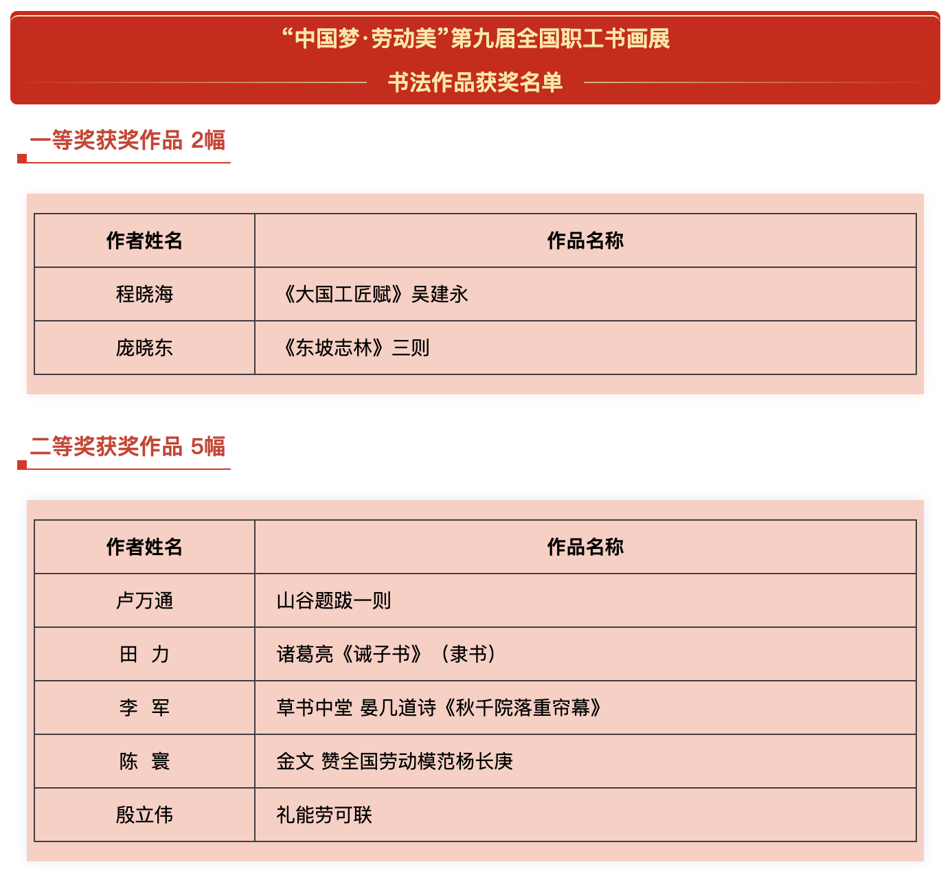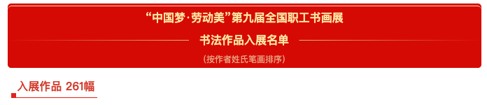 经专业评委线下评审,全国职工文体示范活动、“中国梦·劳动美”第九届全国职工书画展入展作品已选出,其中书法类作品296幅(35幅获奖)、美术类作品200幅(39幅获奖),现将终评结果进行公示,公示期自2024年11月1日至11月5日。如无异议,11月下旬将在浙江省金华市举办线下展览,展出下列作品(最终获奖结果以展览现场公布为准,请勿自行发布宣传)。