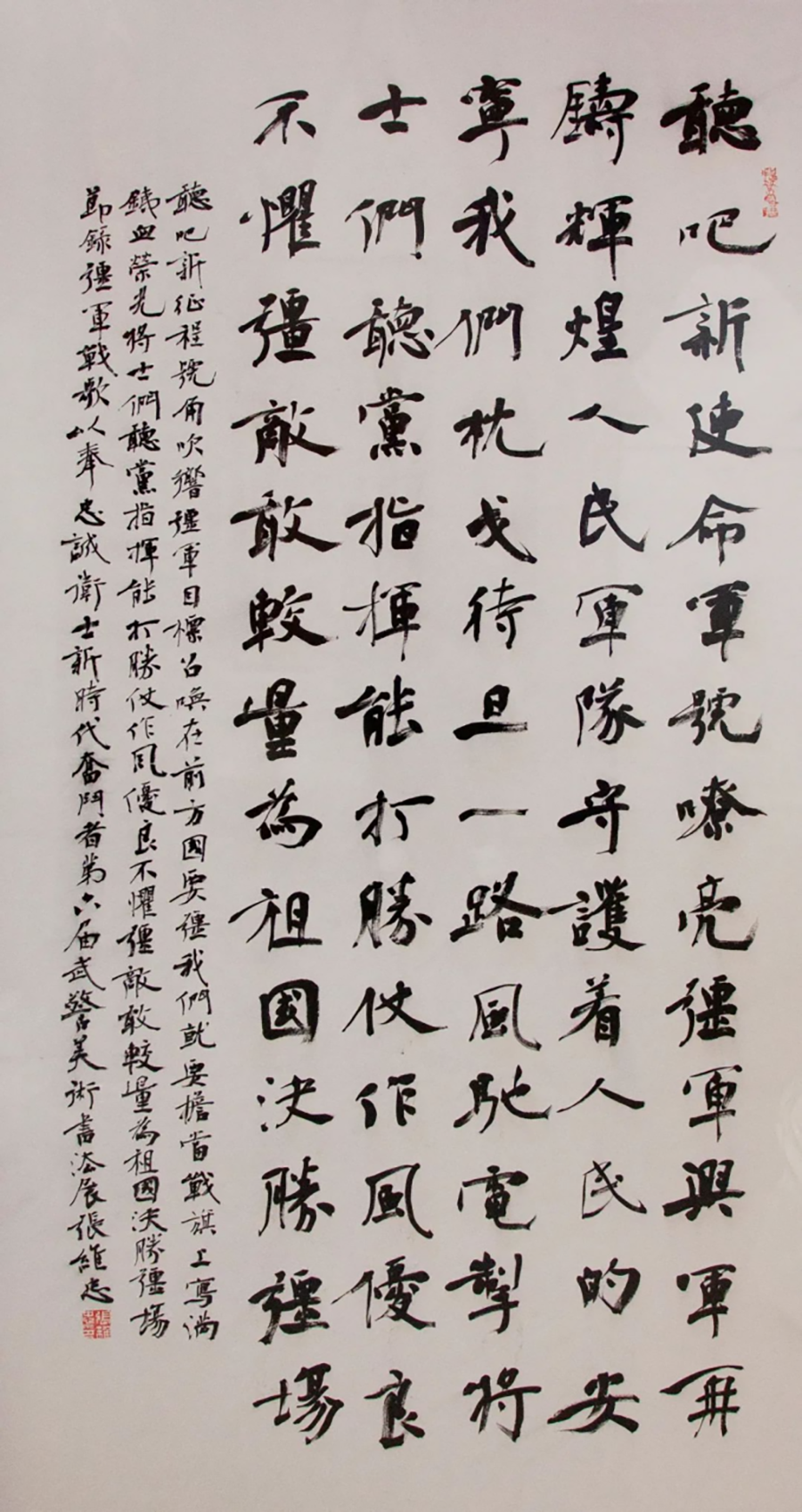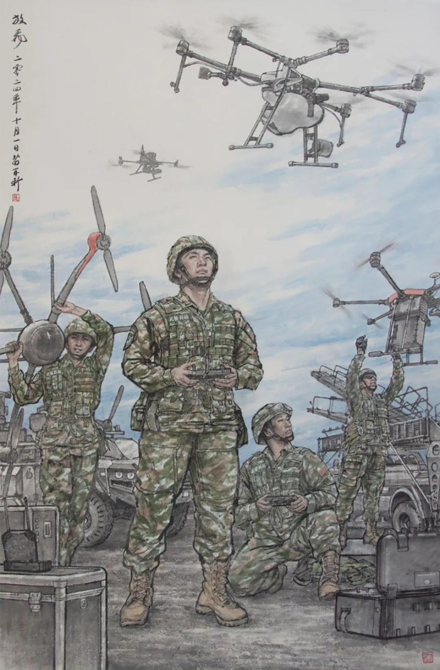 以笔墨书写荣光,以丹青致敬忠诚。此次参展作者既有身披戎装的奋斗者,也有心系部队的拥军人;既有德艺双馨的大家名家,也有青出于蓝的后起之秀。他们为强军服务、为基层服务、为官兵服务,溯信仰之源、砺胜战之气、扬奋斗之志,诠释初心大爱,绘就强军兴军壮美画卷。