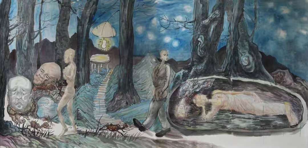 尤为可贵的是,韦申始终秉持着“艺术直面人心”的创作信念。他深入潜意识的幽微之处,将梦境转化为可视的精神图景,以画笔解剖那些被日常伪装掩盖的真实情感。这种探索既是对“伪真”世界的祛魅,也是对人性本真的呼唤。在他的画面中,层层叠染的肌理与夸张变形的形象共同构筑起强烈的精神张力,水墨的灵动与油彩的厚重相互碰撞,产生出震撼心灵的视觉韵律。