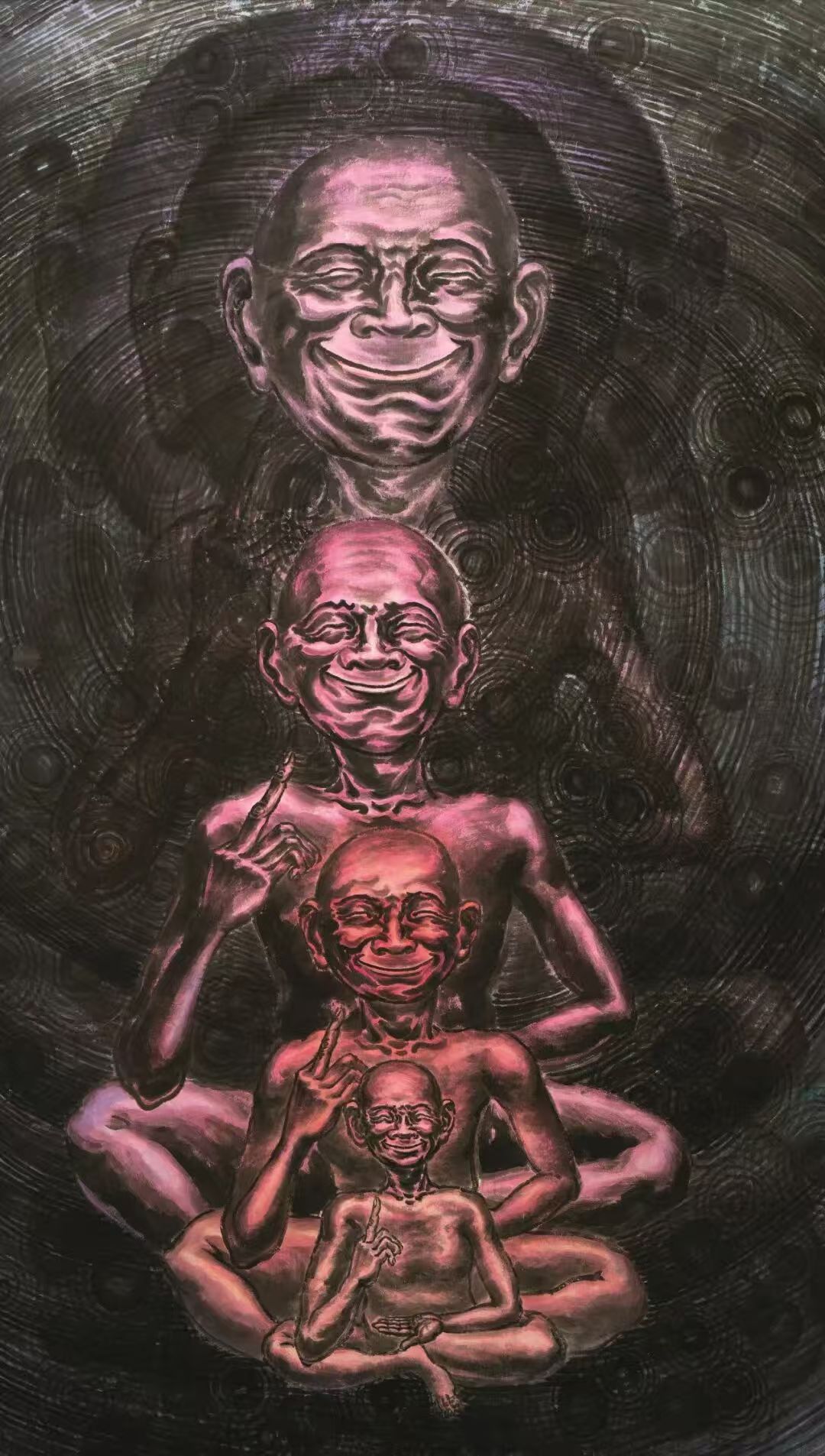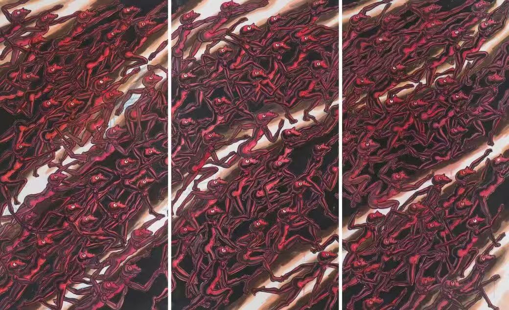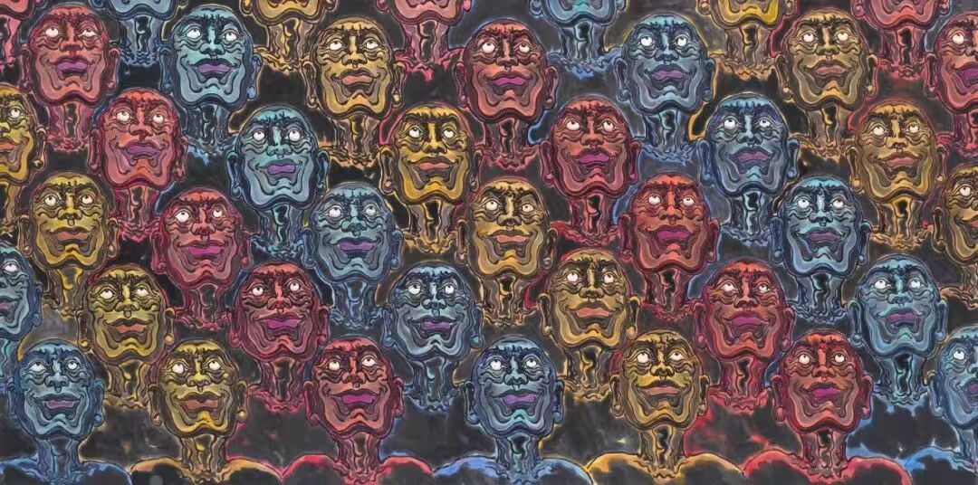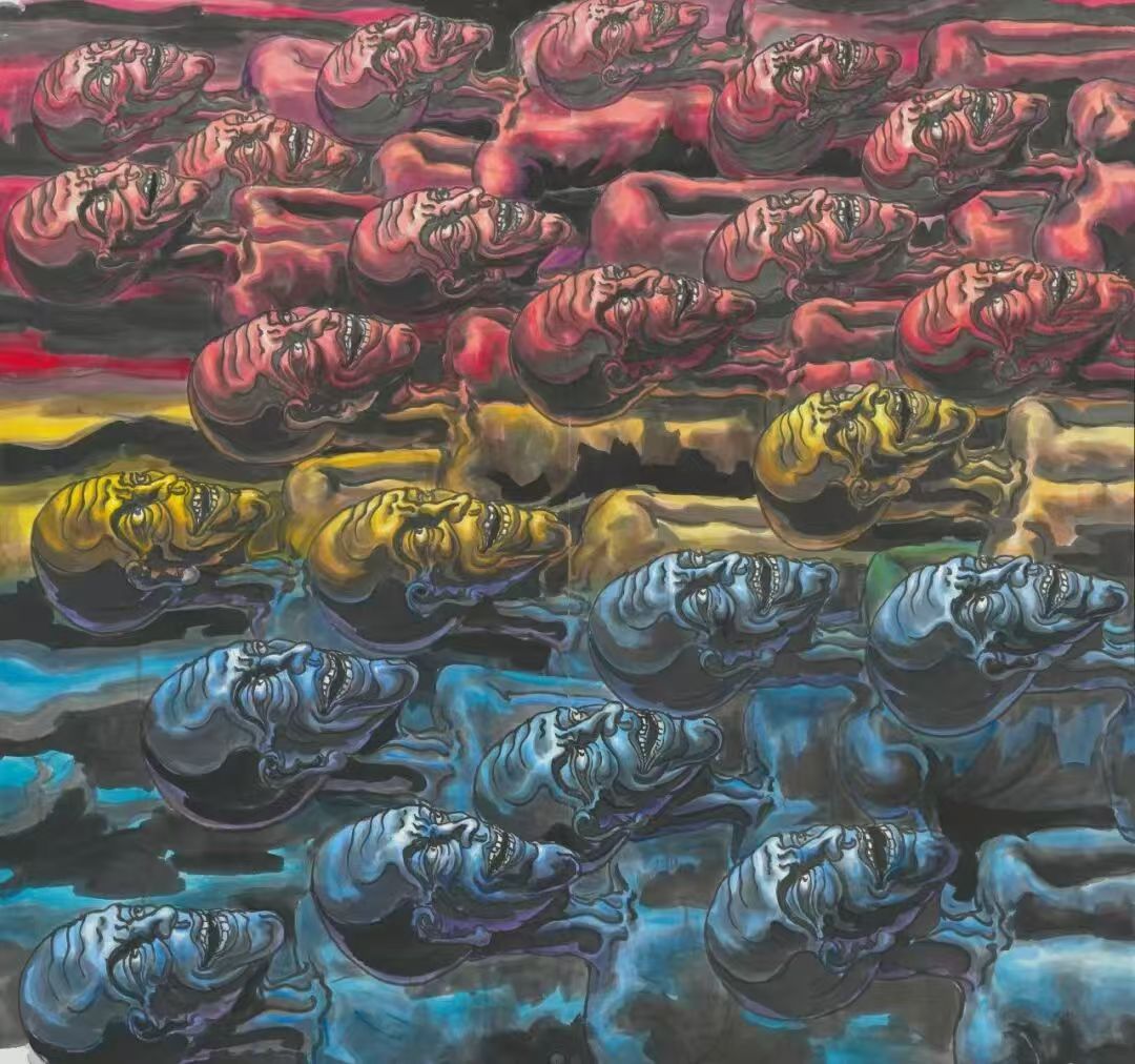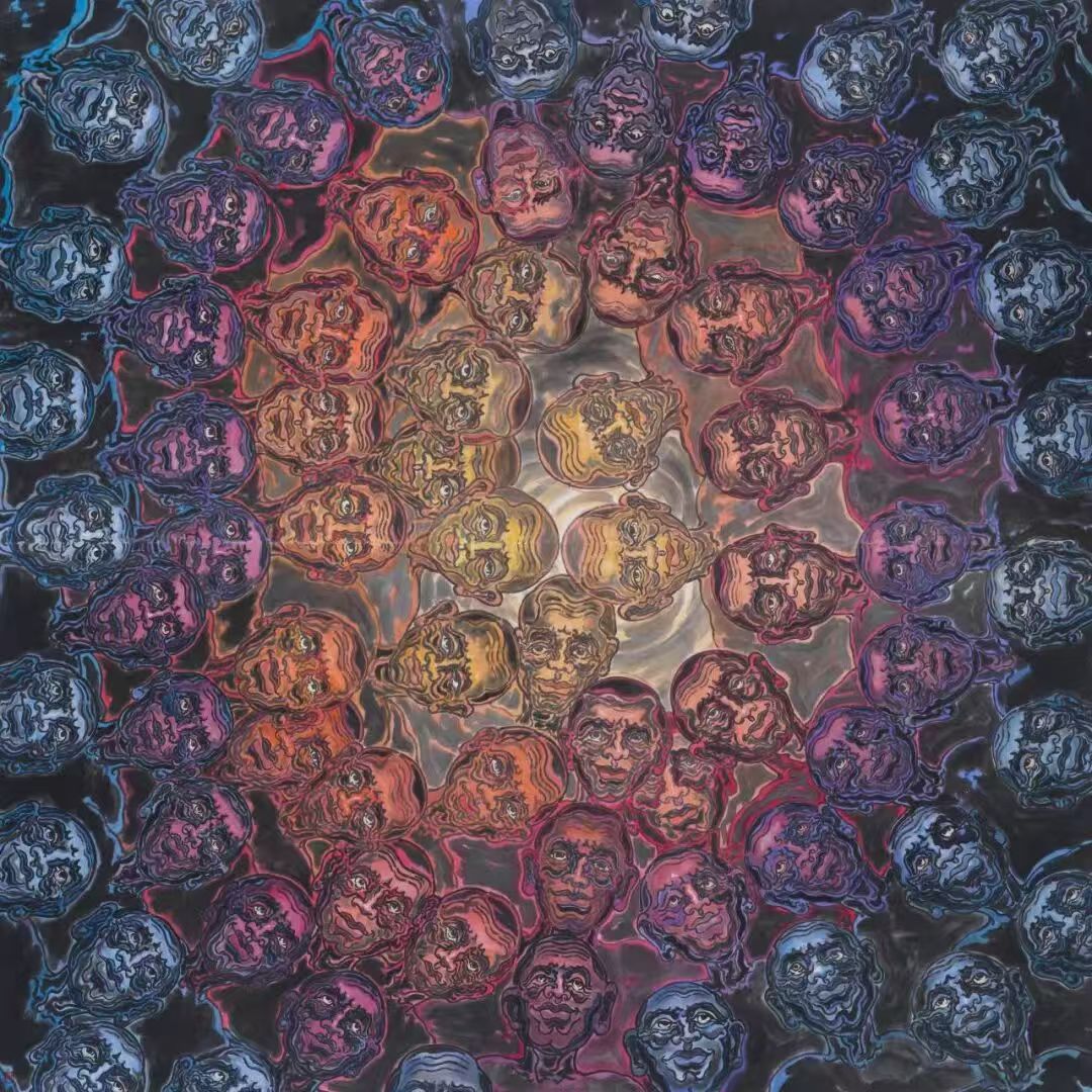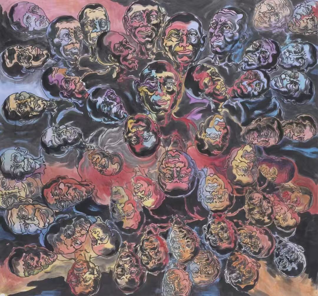 在对“象”的维度进行哲学追问与视觉建构的同时,韦申的智慧亦在于以举重若轻的形式语言,坚守其深邃的精神内核。他的创作媒材游走于宣纸的氤氲与油彩的肌理之间,不拘一格,而色彩则精炼而富有内在的象征性,成为贯通“外象”、“意象”与“心象”的视觉纽带。其《人山人海系列》以无数重复、符号化的个体构建宏大的视觉场域,在局部具象与整体抽象的张力中,既是对集体无意识这一现代“外象”的捕捉,亦是通过形式重复进入潜意识轨迹、最终凝练为“心象”的精神仪式。而《众生相系列》则转向对个体精神肖像的深层刻画,通过细腻且充满魔幻现实感的笔触,将日常人性升华为寓言性的生命图景,在“意象”的营造中揭示精神世界的丰饶与复杂。